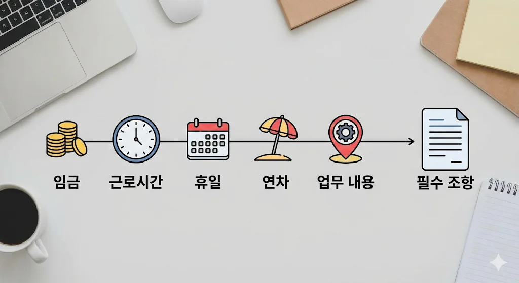 2. 근로기준법이 정한 5가지 핵심 필수 조항은 무엇인가요?