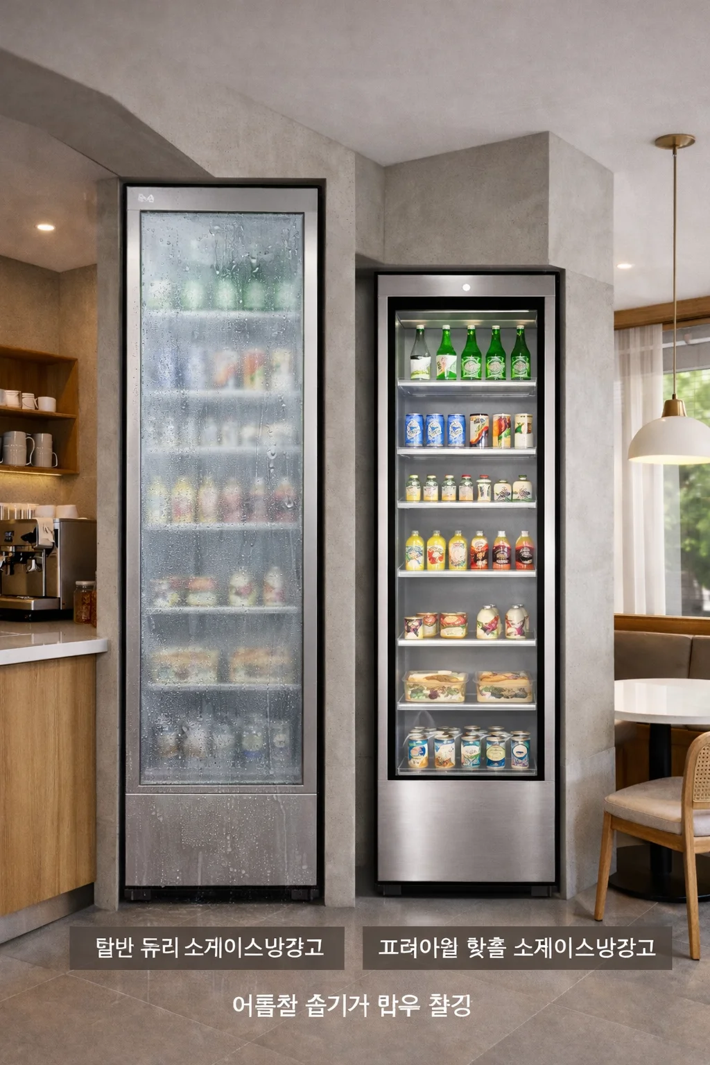 위 표를 보면 알 수 있듯이, 프리미엄 라인은 결로 현상을 원천 차단하는 기술이나 저소음 설계를 기본으로 탑재하고 있어요. 매장이 조용한 카페라면 냉장고 돌아가는 소음 하나가 분위기를 완전히 깰 수 있는데, 이런 디테일에서 차이가 발생하는 거죠.