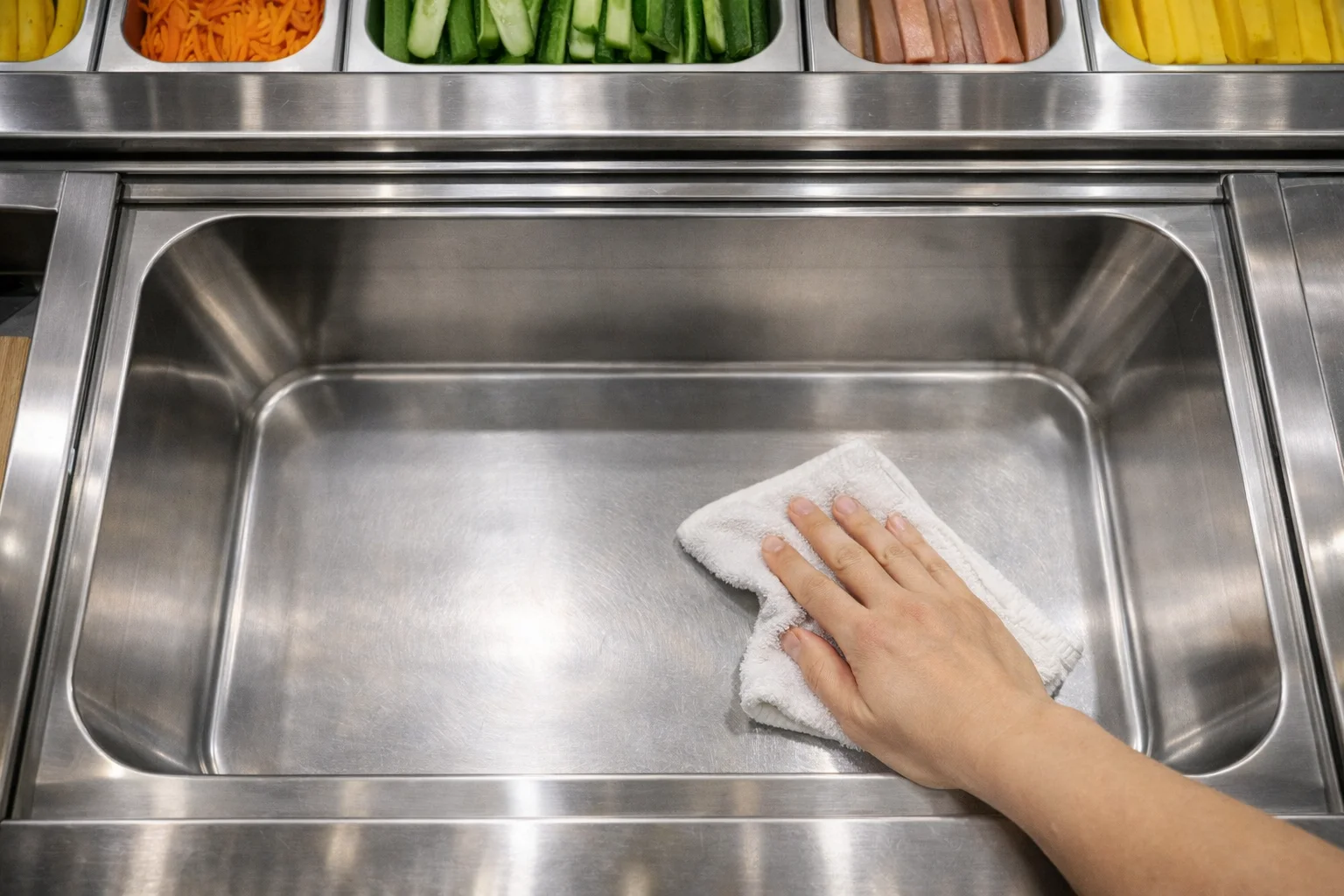 김밥은 위생이 전부라고 해도 과언이 아니죠. 재료 국물이 흐르거나 가루가 떨어지기 쉬운 김밥냉장고 상단 바트 부분, 청소하기 너무 힘들지 않으셨나요? 맞춤 제작의 묘미는 바로 여기서 나와요.
