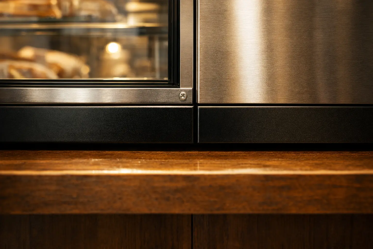 첫째는 환기 공간입니다. 쇼케이스 하단 기계실의 열이 잘 빠져나갈 수 있도록 카운터 하단에 충분한 타공이 되어 있는지 설계 단계에서 협의해야 합니다.
