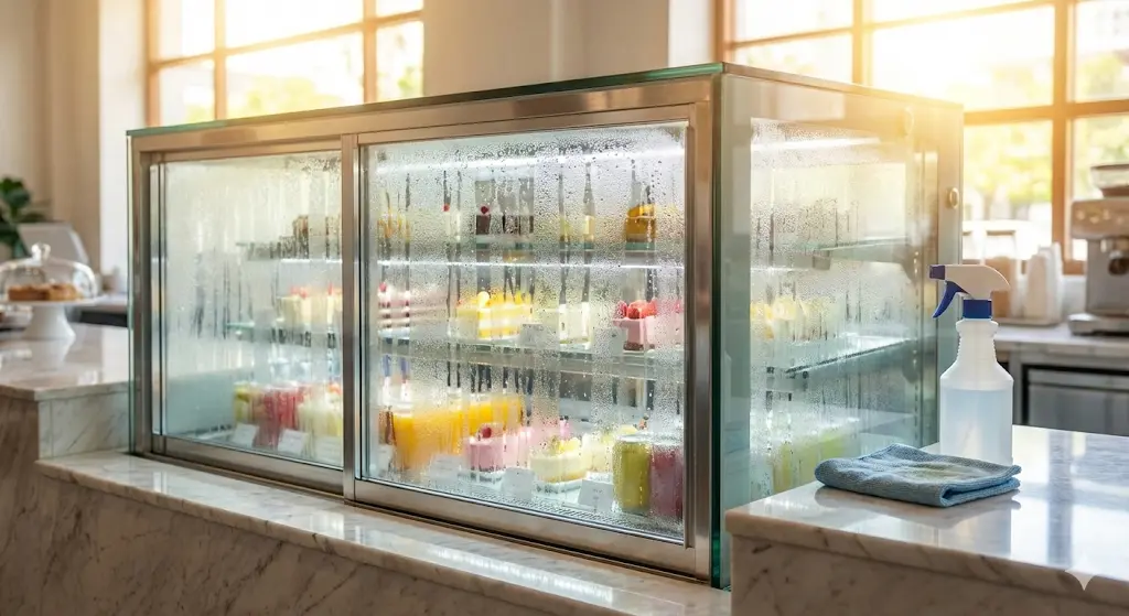 저가형 쇼케이스의 빈약한 단열 구조와 저품질 유리는 외부 온도차를 견디지 못하고 '눈물 흘리는 유리창'을 만들어 매장의 청결 신뢰도를 떨어뜨립니다.