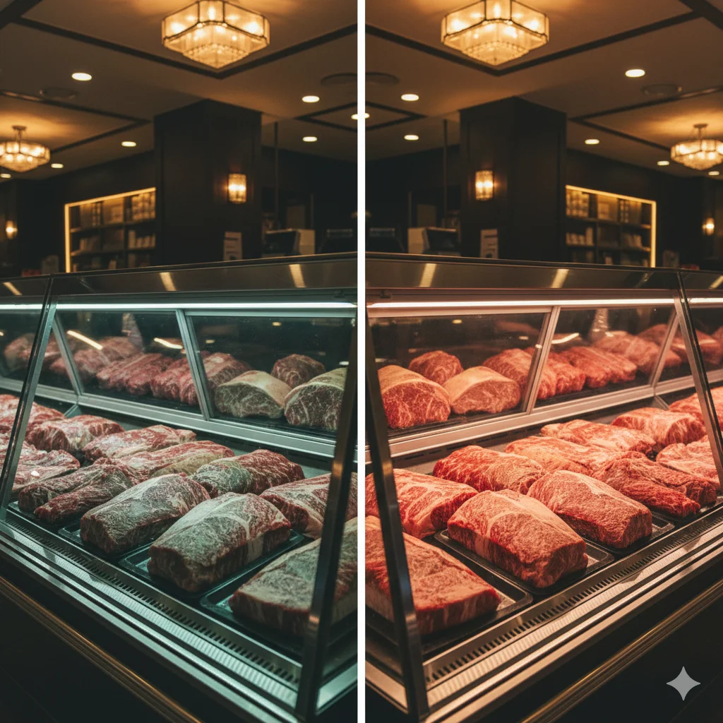 많은 업체가 저가형 LED 바를 사용하여 단순히 밝기만 높이는데, 이는 고기의 붉은 선홍빛을 왜곡시켜 마치 '모형 고기'처럼 차갑고 칙칙해 보이게 만듭니다.