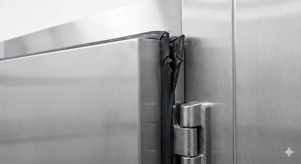 대형 도어의 하중을 계산하지 못한 빈약한 경첩과 저가형 가스켓을 사용했기 때문에 발생하는 ‘구조적 골다공증’ 현상입니다.