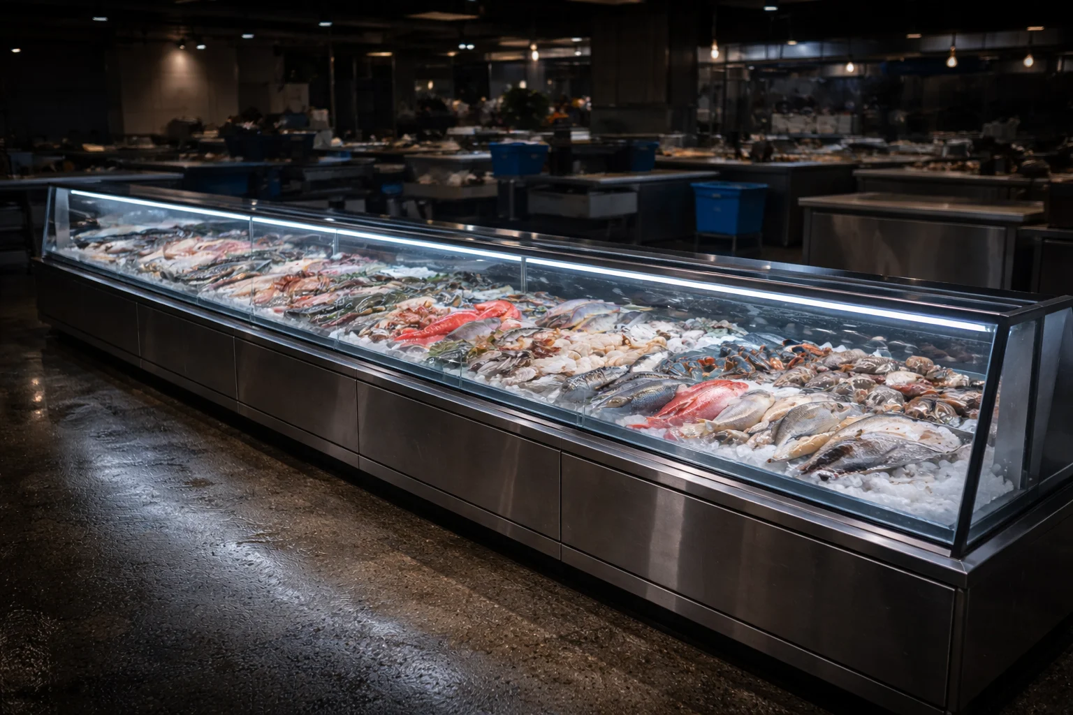 단열 유리의 성능이 중요하며, 결로 현상을 막아주는 히팅 기능이 제대로 작동하는지 수시로 점검해야 합니다. 유리창에 김이 서리면 손님이 생선을 제대로 볼 수 없어 구매 포기로 이어지기 때문입니다.