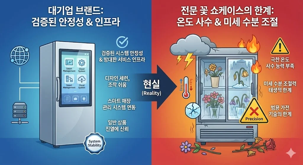 ํ์ง๋ง ์๋ฏผํ ์์ฌ๋ฃ์ธ ์ํ๋ฅผ ๋ค๋ฃจ๋ ์ ๋ฌธ ๊ฝ ์ผ์ผ์ด์ค ๋ถ์ผ์์ ๋ฒ์ฉ ๊ฐ์ ๊ธฐ์ ์ '๊ฐํนํ ์ธ๋ถ ํ๊ฒฝ ๋ณํ ์ ์จ๋ ์ฌ์ ๋ฅ๋ ฅ'๊ณผ '๋ฏธ์ธ ์๋ถ ์กฐ์ ๋ ฅ'์์ ํ์์ ์ธ ํ๊ณ๋ฅผ ๋ง์ฃผํ๊ฒ ๋ฉ๋๋ค.