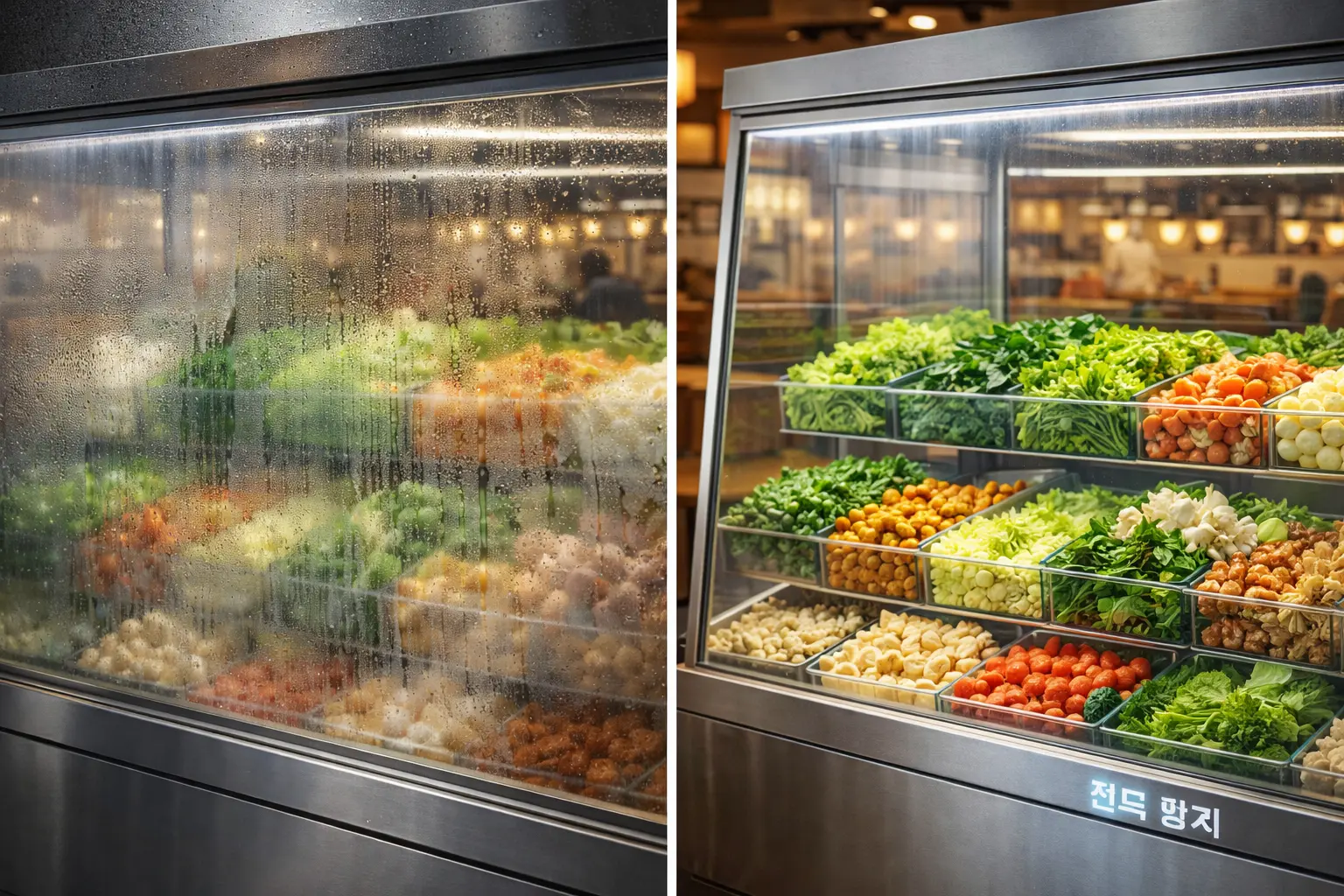 성능이 검증된 장비들은 유리 자체에 미세한 열선을 배치하거나 공기 흐름을 조절해 이러한 현상을 억제합니다. 손님들이 냉장고 앞에 섰을 때 신선한 재료들이 한눈에 선명하게 들어와야 구매 욕구가 자극됩니다.