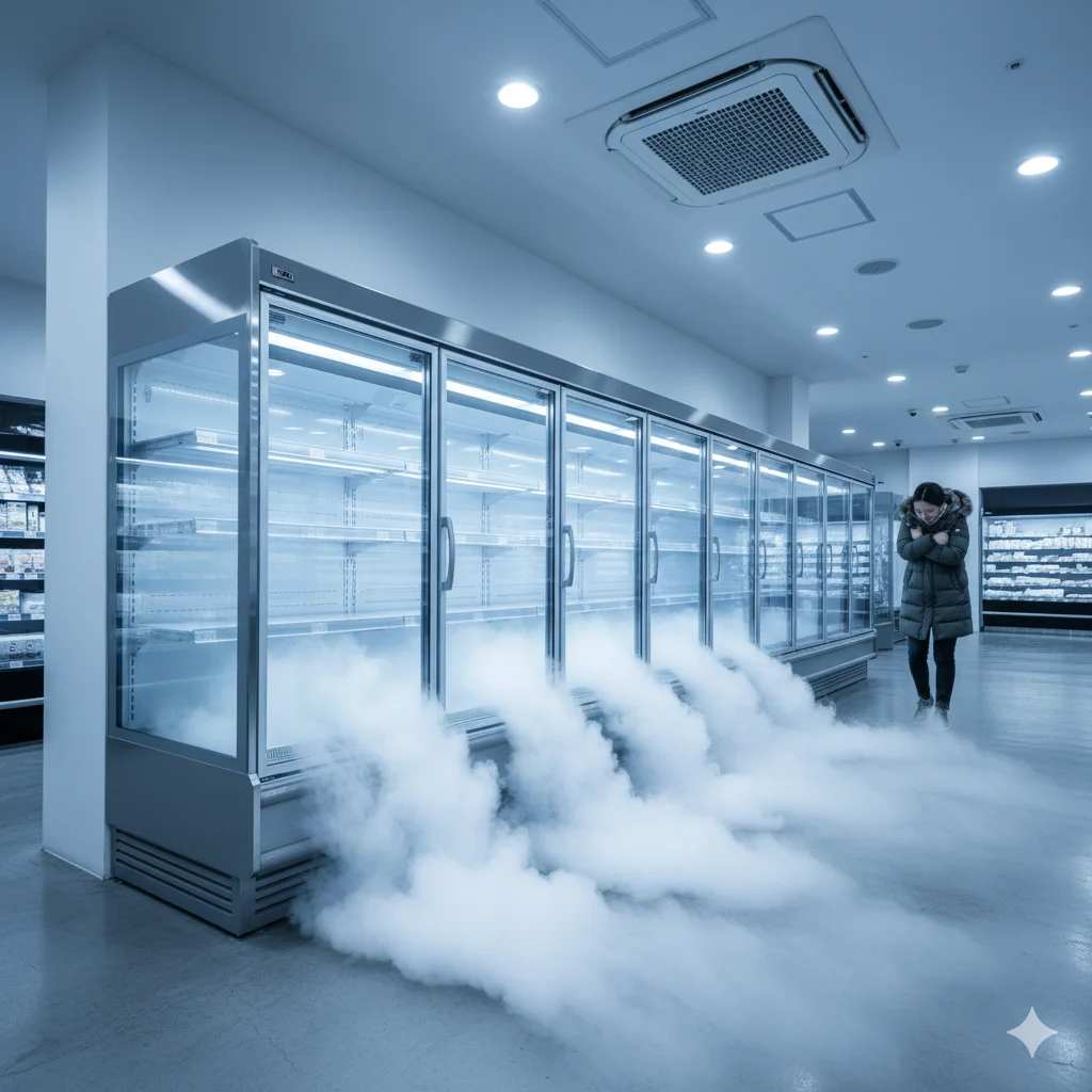Q2. "쇼케이스 앞을 지나가는 손님들이 춥다며 자리를 피해요. 에어컨을 틀지도 않았는데 매장 전체가 냉장고처럼 추워지는 이유가 뭔가요?"