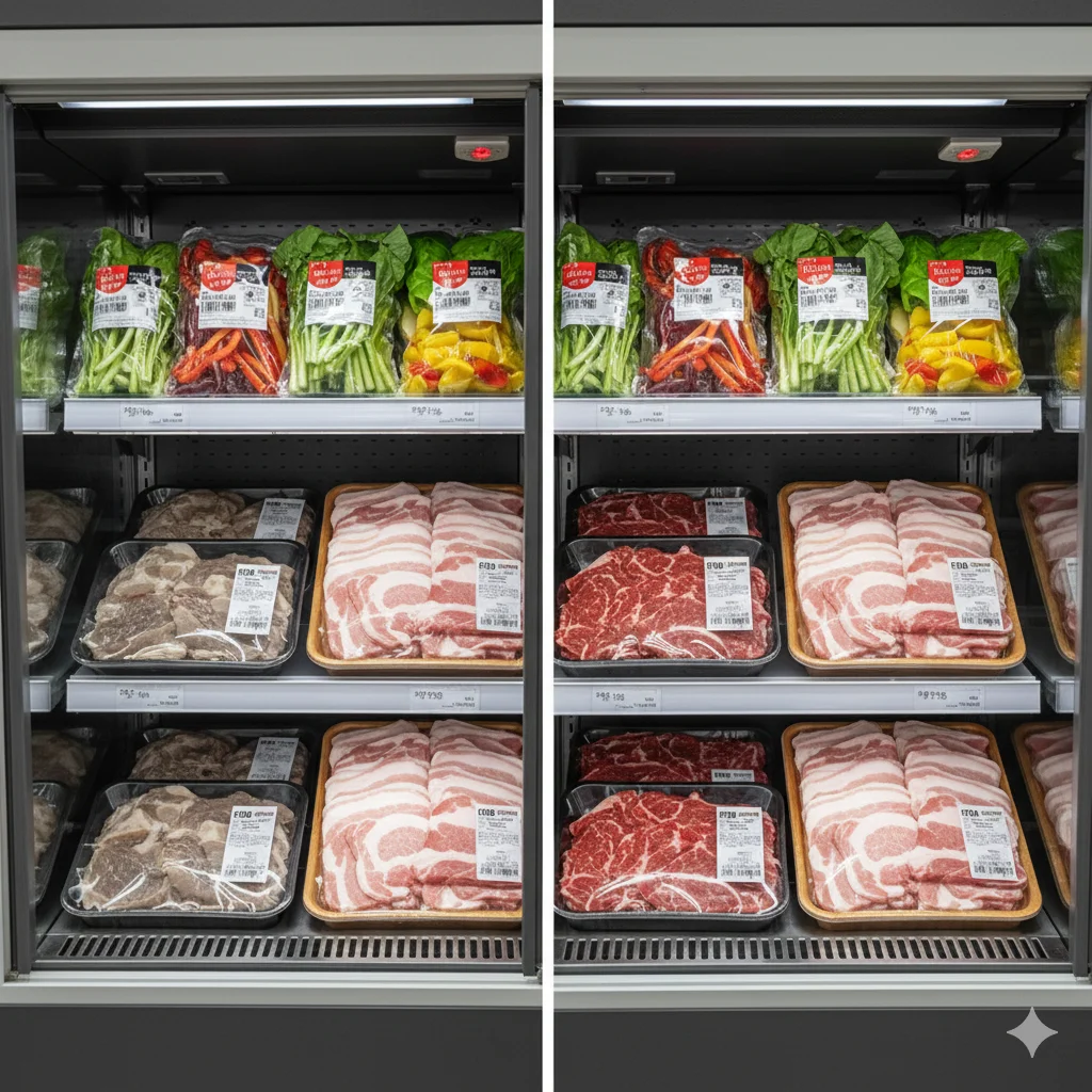 상품의 문제도, 사장님의 진열 솜씨 문제도 아닙니다. 보급형 브랜드가 사용하는 '저가형 블루 칩 LED'가 상품 본연의 색 파장을 지워버리기 때문입니다.