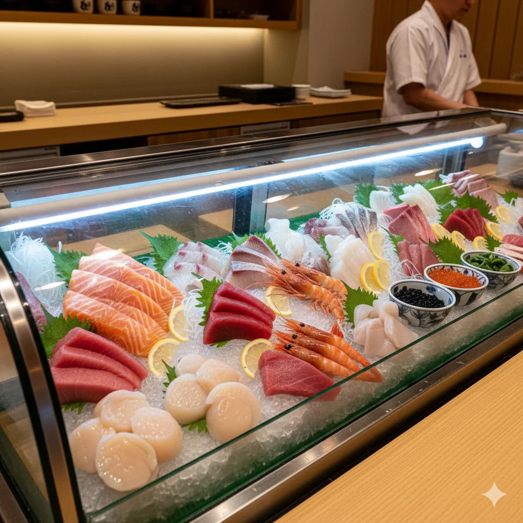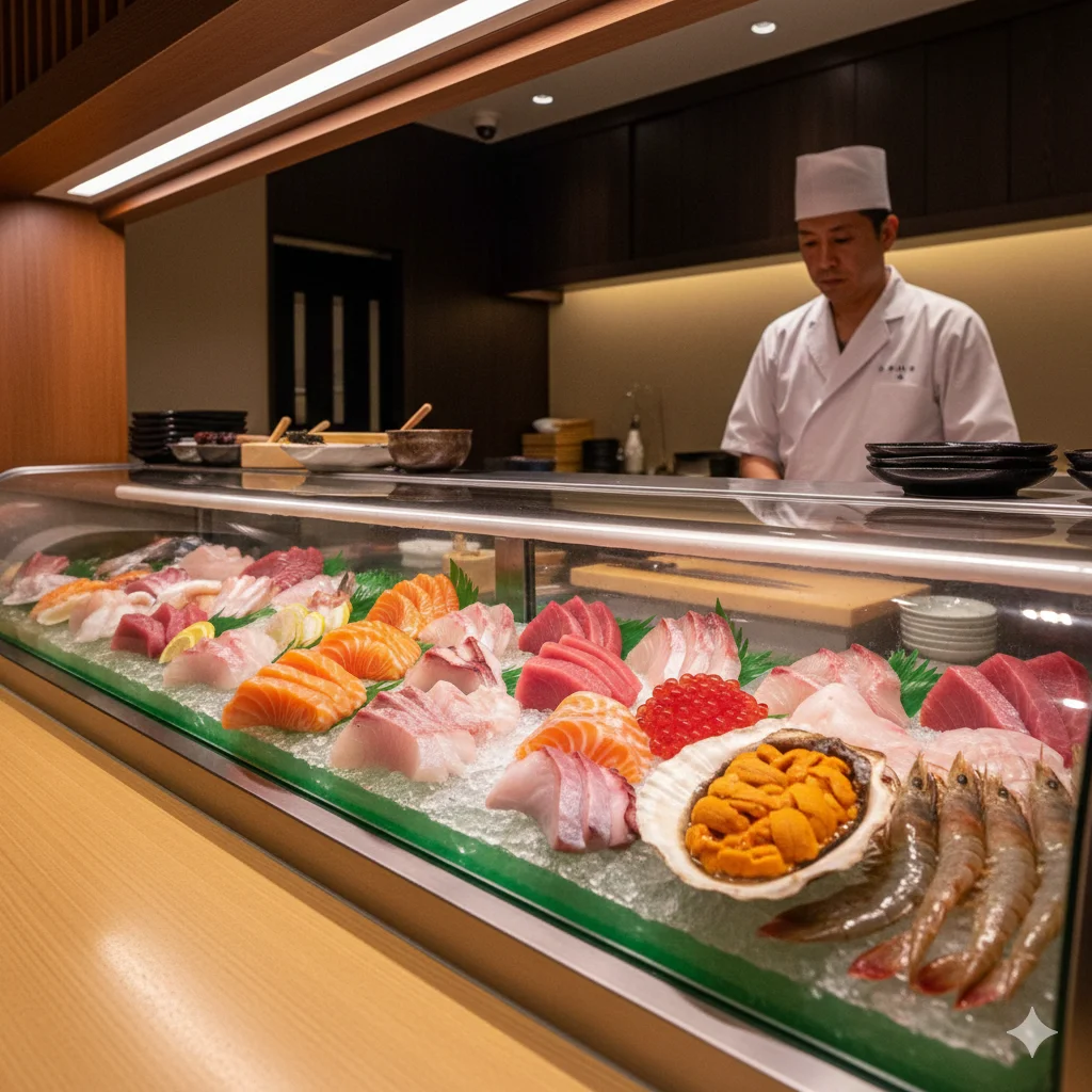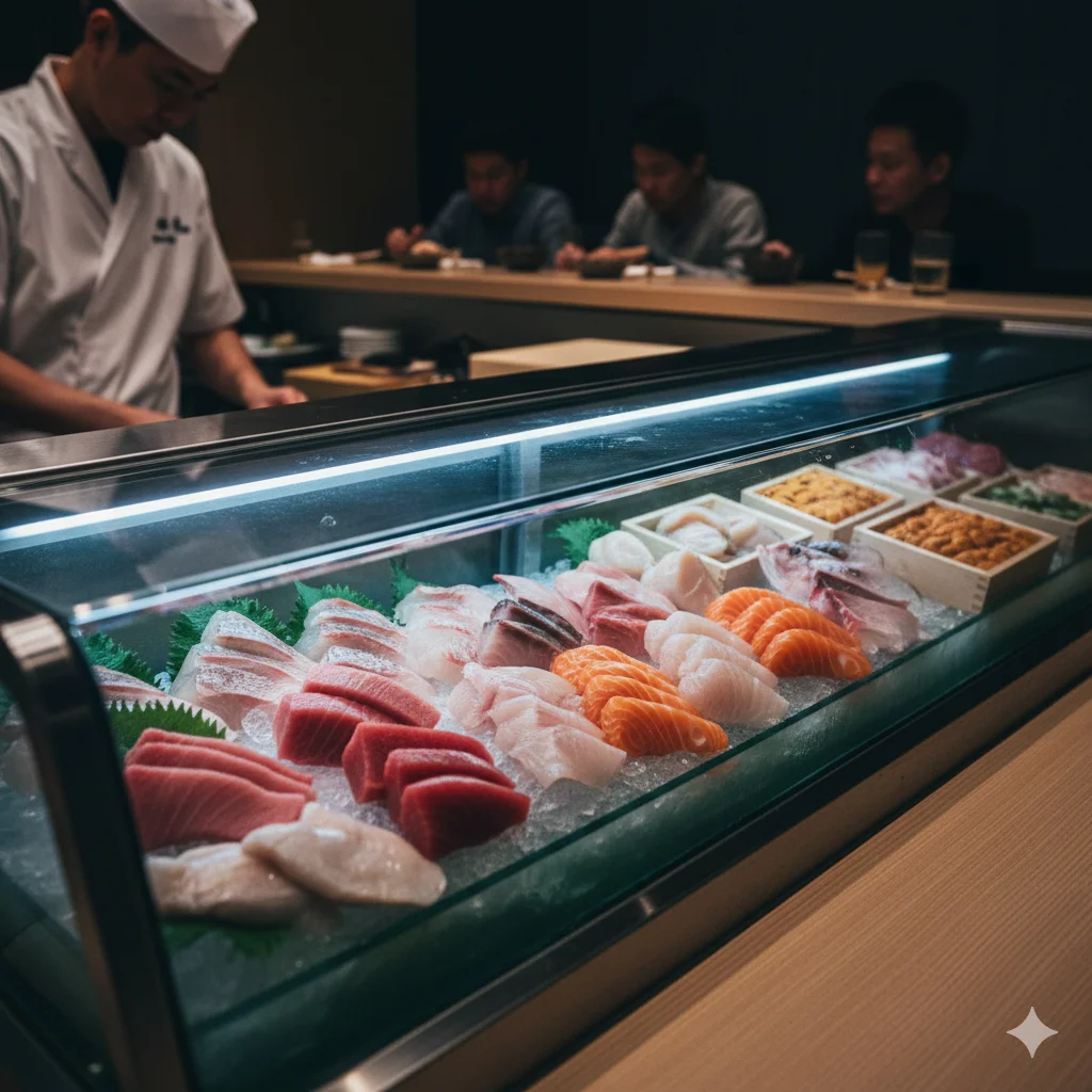입니다. 이곳에 진열된 생선 횟감(네타)의 상태는 단순히 식재료의 선도를 넘어, 그 매장