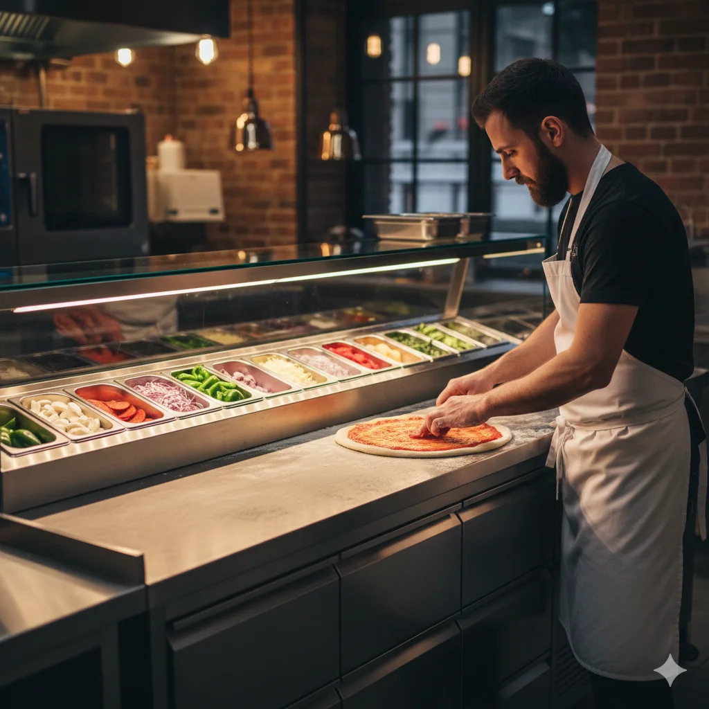 니다. 이는 피자 제작 시간을 획기적으로 단축하고, 주방 동선을 최소화하여 혼잡한 시