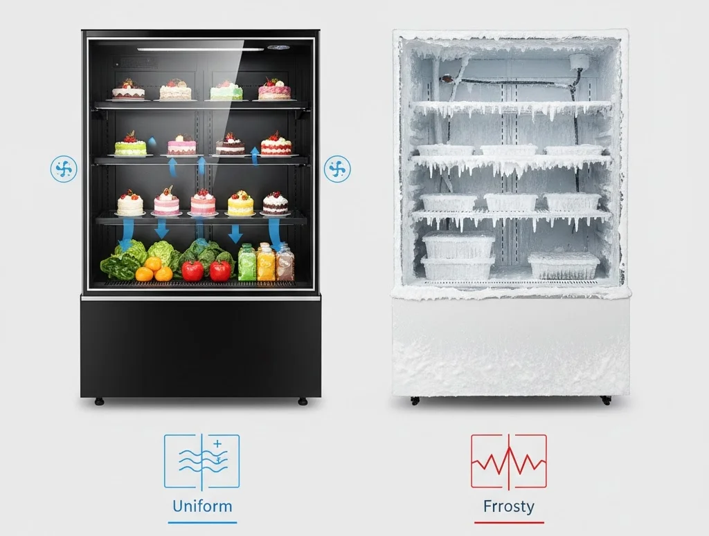한성만의 간냉식 설계는 강력한 냉각 속도를 자랑하여 문을 자주 여닫는 매장 환경에서