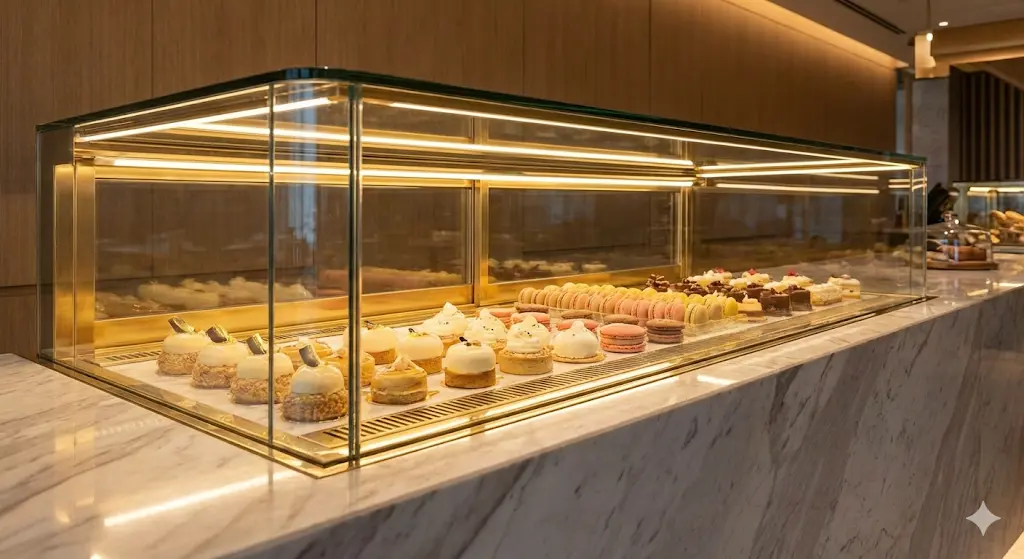 특징: 3중 유리 적용으로 단열 성능을 높이고, LED 조명을 배치하여 진열된 케이크의 색감을 살려줍니다.