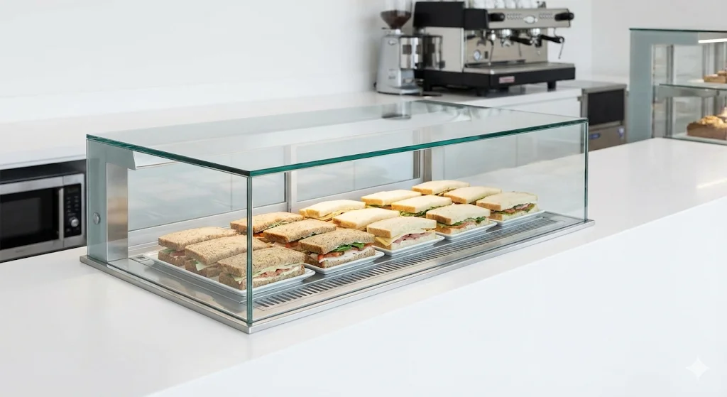 이때 진열장 내부의 선반 각도를 5~10도 정도 앞쪽으로 기울여 제작된 샌드위치 냉장고를 선택하면, 고객이 허리를 숙이지 않고도 내용물을 한눈에 확인할 수 있어 구매 만족도가 크게 향상됩니다.