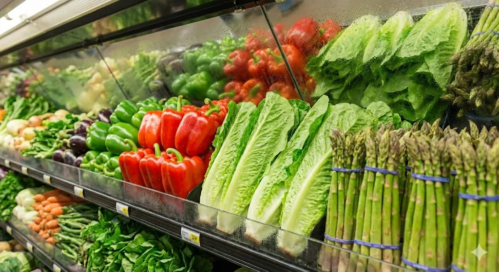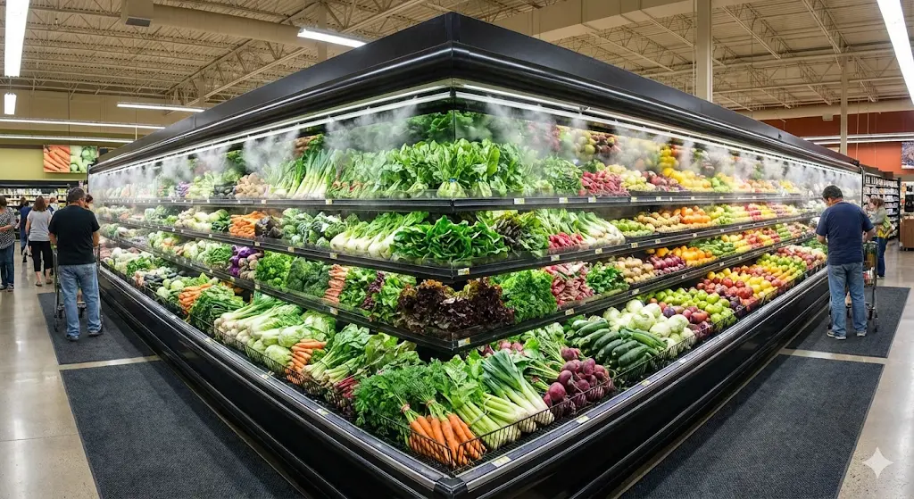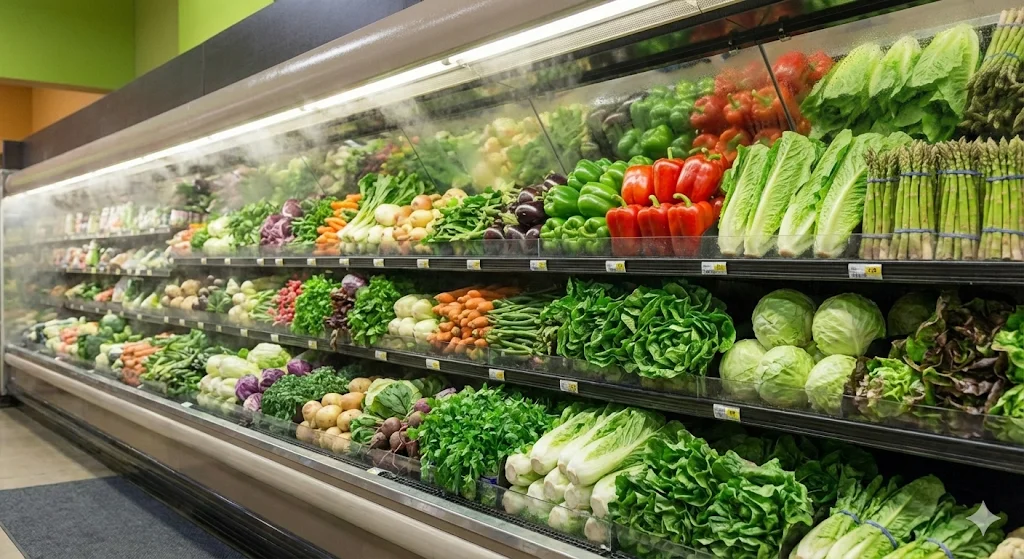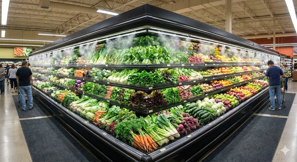 또한, 대형 매장일수록 진열장의 깊이와 높이가 매출에 큰 영향을 미칩니다. 고객의 눈높이에 맞춘 다단 설계와 사각지대 없는 조명 배치는 고객이 멀리서도 신선한 야채를 발견하고 다가오게 만드는 강력한 마케팅 도구가 됩니다.
