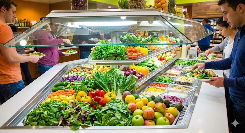 뷔페나 샐러드 바에서 사용하는 야채 냉장고는 고객의 접근성이 좋아야 하므로 문이 없는 오픈형 쇼케이스 형태가 많습니다.