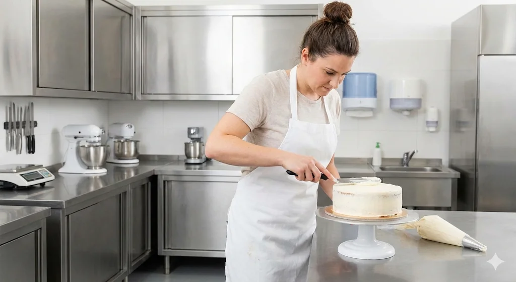 작업 효율을 높이는 주방 동선: 케이크는 전처리, 시트 굽기, 아이싱, 장식 등 공정이 많습니다. 작업자가 지치지 않고 효율적으로 움직일 수 있는 주방 설비 배치가 생산성을 결정합니다.