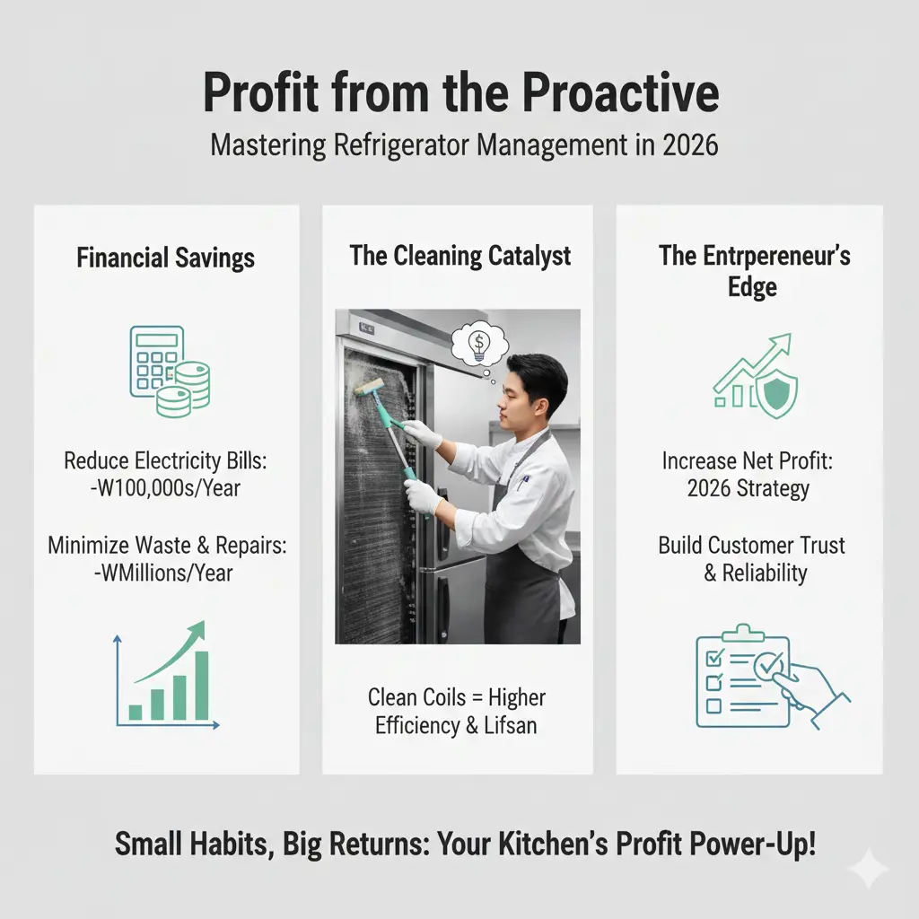 오늘 당장 영업이 끝난 후, 우리 매장 냉장고 뒤편의 응축기를 한번 살펴보세요. 두껍게 쌓인 먼지를 털어내는 그 순간부터 사장님의 수익은 올라가기 시작합니다.