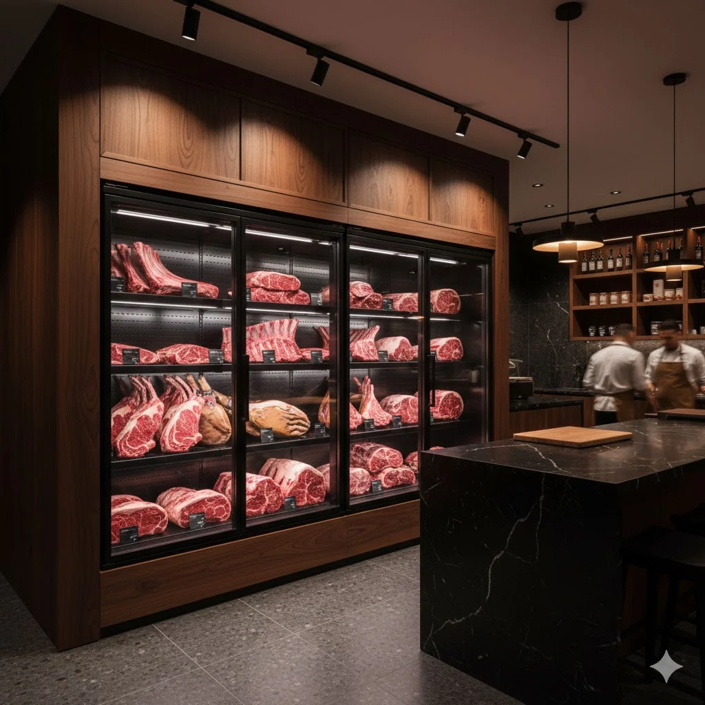 특수 Low-E 기술이 적용된 유리는 시간이 지나도 맑은 시야를 선사하여 고기의 가치를 선명하게 전달합니다.