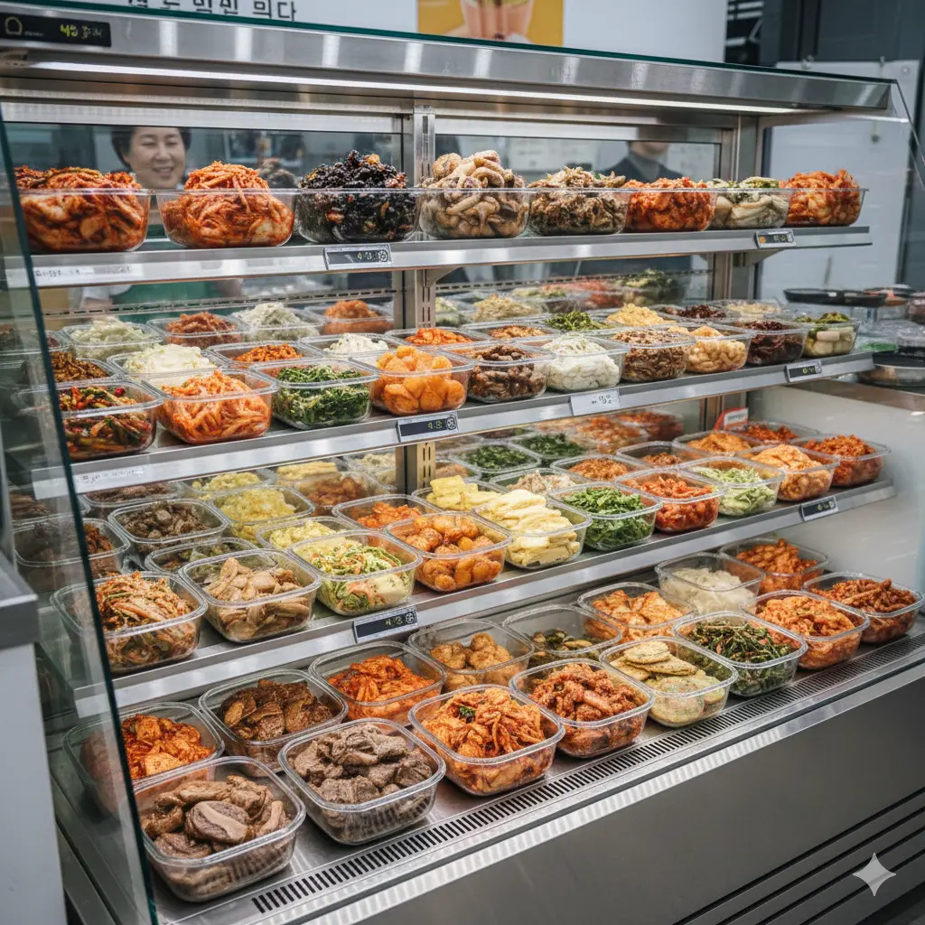반찬 쇼케이스의 핵심은 '전시'입니다. 고객이 먹음직스러운 나물과 조림류를 명확히 볼 수 있어야 구매로 이어지죠.
