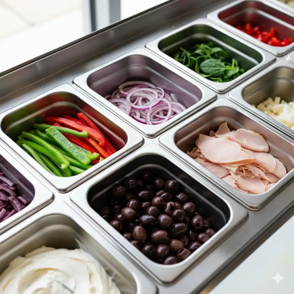 토핑용 야채, 소스, 손질된 육류 등 수십 가지 재료를 각각의 '바트(Vat, 용기)'에 담아 신선하게 보관하며 즉석에서 조리하는 이 장비는 단순한 냉장고를 넘어 주방의 워크스테이션 역할을 합니다.
