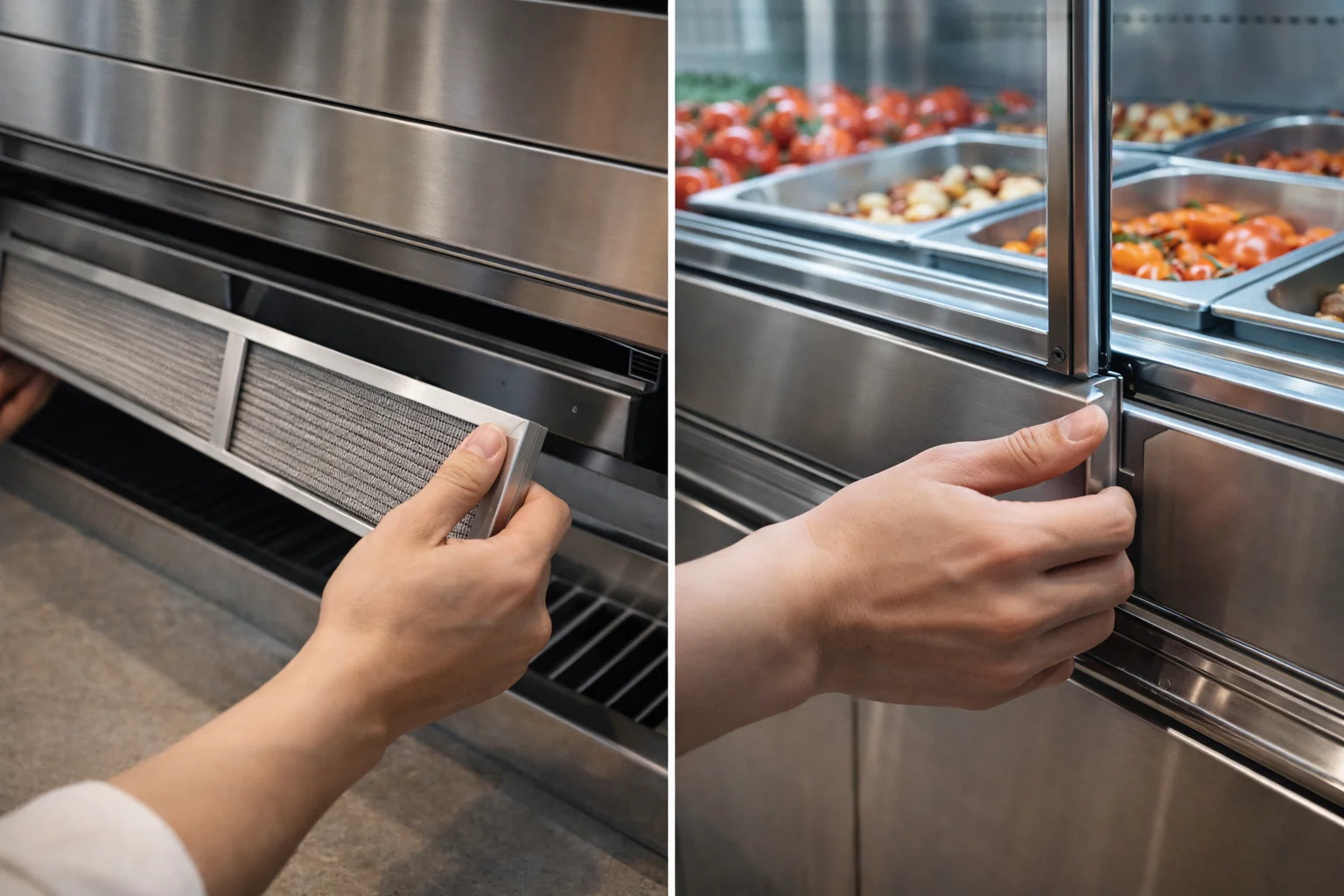 바쁜 피크 타임에 장비 바닥에 물이 고이거나 필터 청소가 까다로우면 직원의 업무 강도는 올라가고 서비스 질은 떨어지게 됩니다. 관리가 편한 장비는 하단 배수 시스템이 잘 갖춰져 있고, 누구나 쉽게 필터를 분리해 세척할 수 있어야 해요. 청결한 상태를 유지하기 쉬워야 위생 검열에서도 자유롭고 손님들에게 신뢰를 줄 수 있습니다.