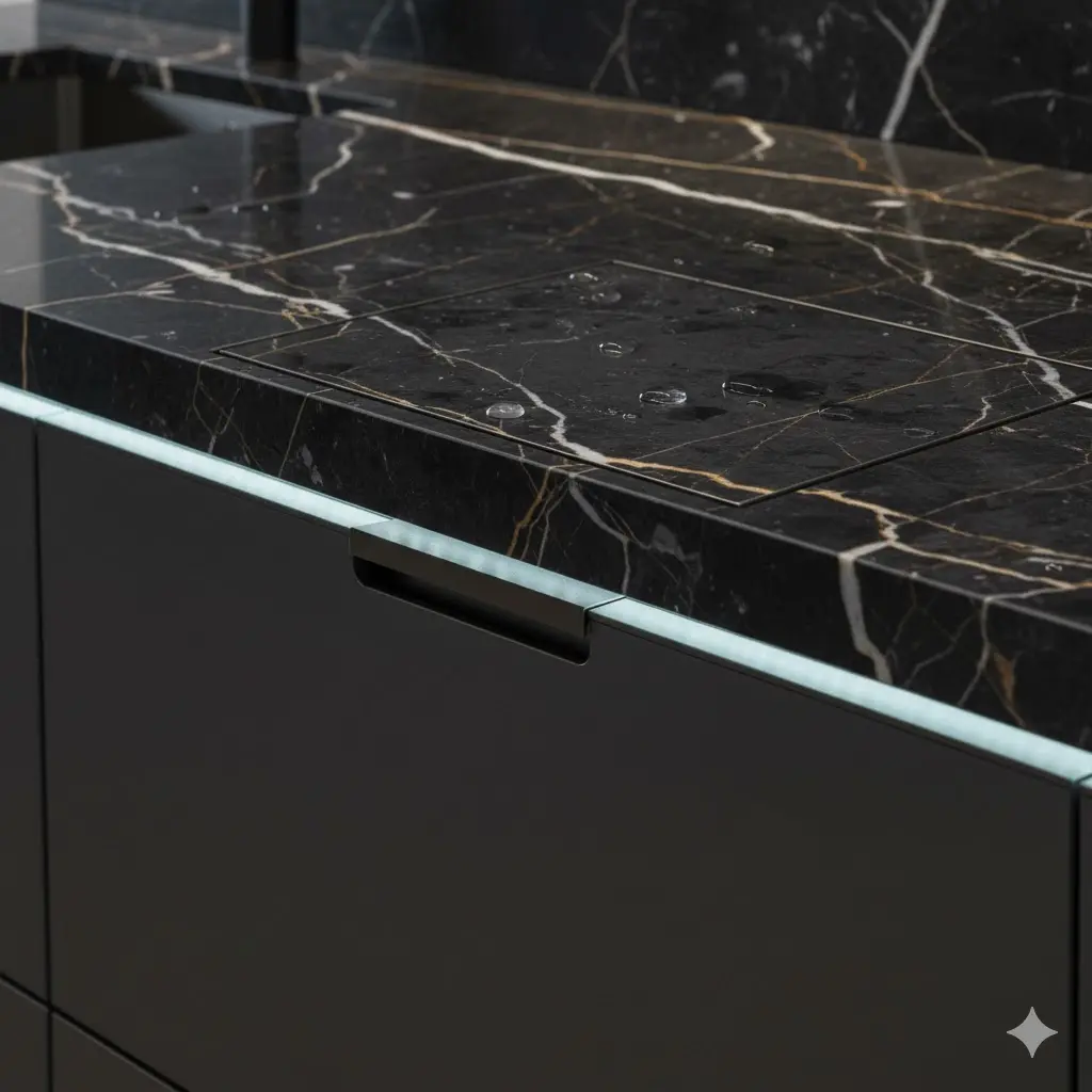 상판 견고함 | 표준 작업대 수준 | 보강재 적용 (우수함) | 대리석 일체형 또는 강화 보강 상판 |
