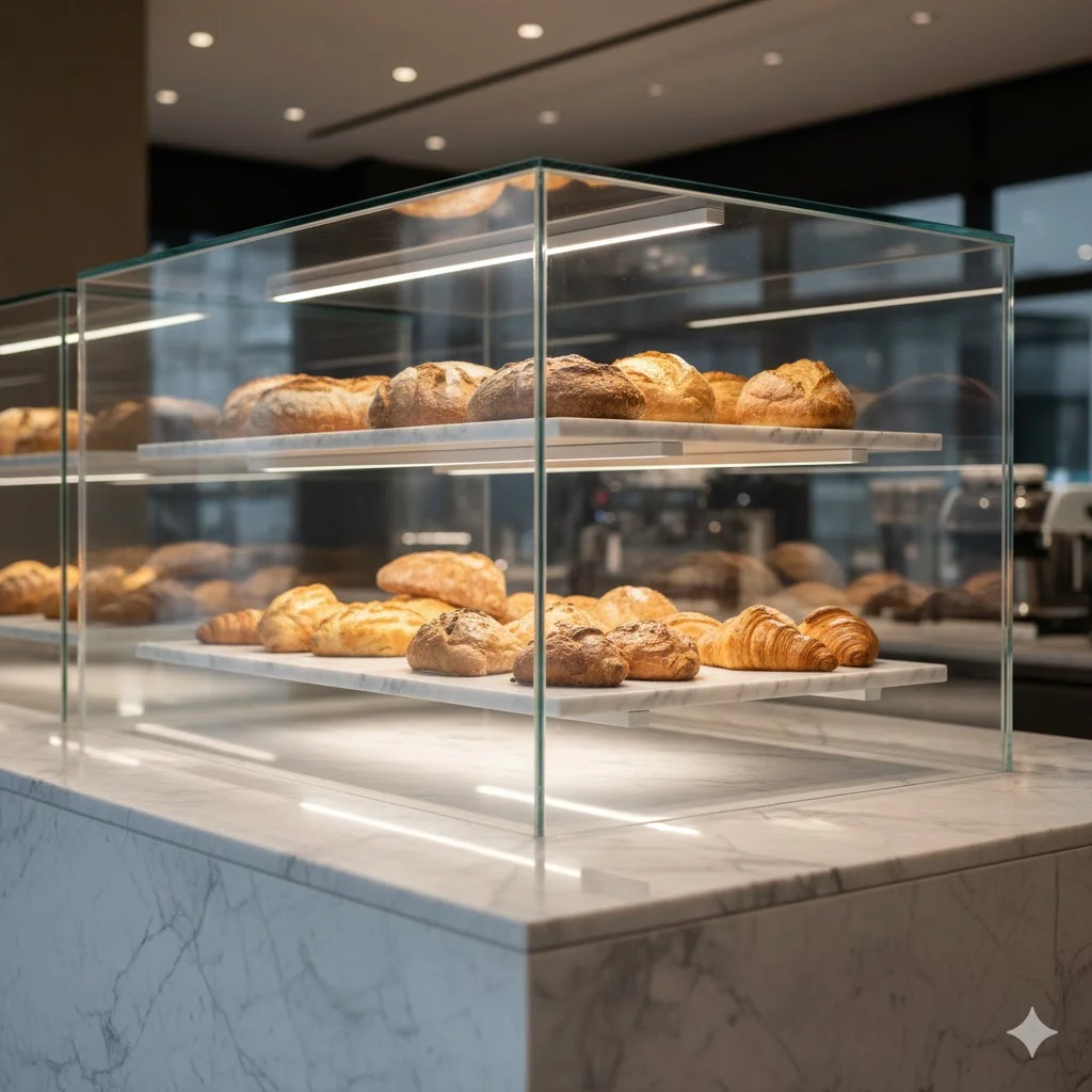 초고투명 '다이아몬드 커팅' 유리: 일반 유리의 녹색 빛을 완전히 제거한 백유리를 사용해 빵의 질감을 입체적으로 드러냅니다.