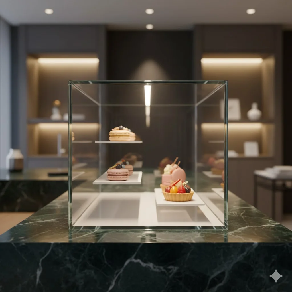 시야를 가리는 금속 프레임과 실리콘 자국을 완벽하게 제거한 UV 접합 공법은 내부 제품을 마치 갤러리의 예술품처럼 돋보이게 합니다.