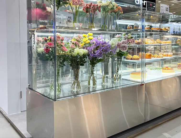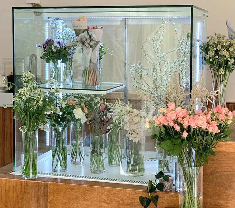 한성꽃냉장고는 스텐 소재나 월넛 컬러도 선택이 가능하더라고요. 사이즈도 매장에 맞춰 1200~1500mm 이상까지 자유롭게 조절할 수 있죠.
