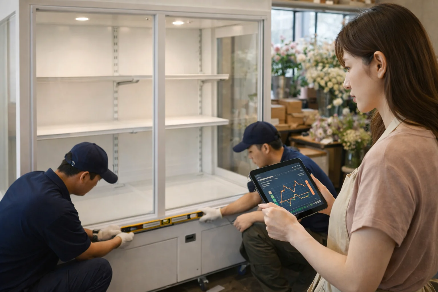 아무리 좋은 장비라도 설치 과정에서 사고가 나면 낭패잖아요? 쇼케이스는 무게가 상당해서 매장 입구가 좁으면 문틀을 떼야 하는 상황이 생기기도 해요. 그래서 설치 기사님의 숙련도가 중요하거든요. 수평이 맞지 않으면 도어에 유격이 생겨서 냉기 손실과 전기료 상승으로 이어지죠.