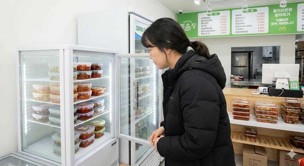 맛이 본질이라면, 그 본질을 고객에게 처음 전달하는 '매개체'는 무엇일까요? 바로 매장 한편에 자리 잡은 미니 반찬냉장고입니다.