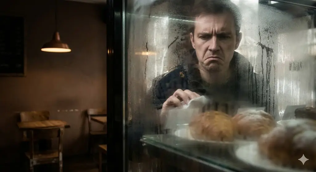 신선도에 대한 의구심: 유리창에 흐르는 물줄기는 고객의 뇌에서 '온도 관리 부실'이나 '기계 결함'으로 자동 치환됩니다.