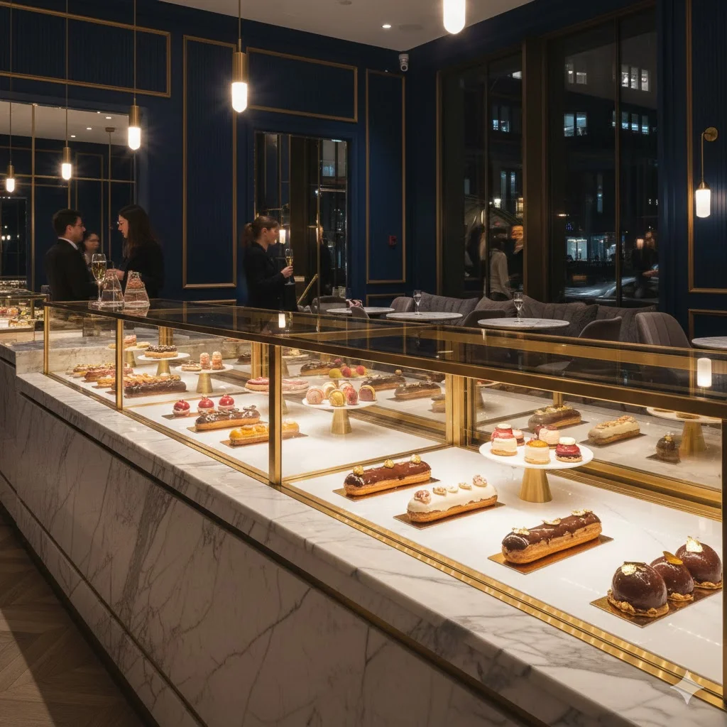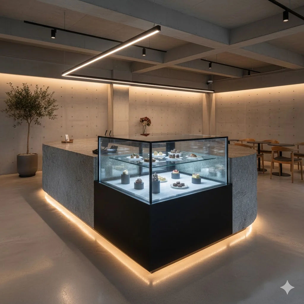 성공의 상징: 한성쇼케이스가 놓여 있다는 것만으로도 고객은 "이곳은 좋은 재료를 쓰는 고급 매장이구나"라고 직관적으로 인지합니다.