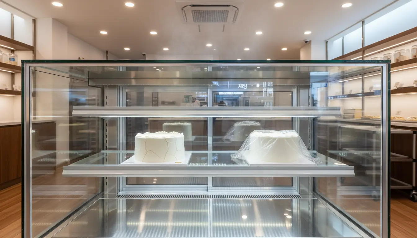 고객의 시선이 프레임에 걸리지 않고 오직 디저트에만 꽂히게 만드는 기술, 이것이 바로 프리미엄의 기준입니다.Q2. 오픈 쇼케이스도 아닌데, 저녁만 되면 케이크 표면이 말라서 쩍쩍 갈라져요. 랩을 씌워놓자니 모양이 빠지는데 어떡하죠?