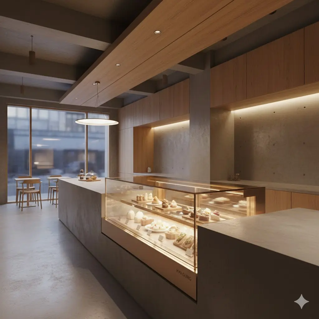 한성은 매장 컨셉에 맞춰 프레임의 색상은 물론, 매끄러운 '심리스(Seamless)' 마감 처리를 통해 쇼케이스가 매장 카운터의 일부처럼 보이게 만듭니다.