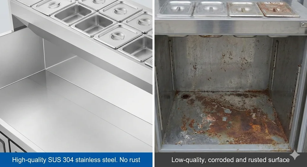 업소용 토핑냉장고 수명을 결정짓는 첫 번째 핵심 요소는 습기와 염분이 가득한 주방 환경을 견뎌내는 '스테인리스'의 품질입니다.