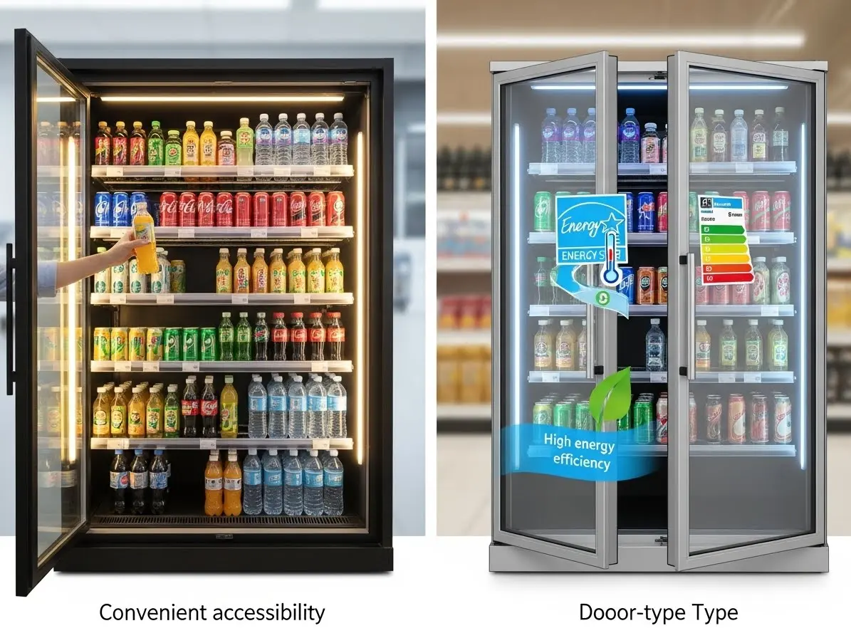 도어형 | 냉기 손실 적어 에너지 효율 좋음. 위생적. | 카페, 레스토랑, 일반 소매점 |