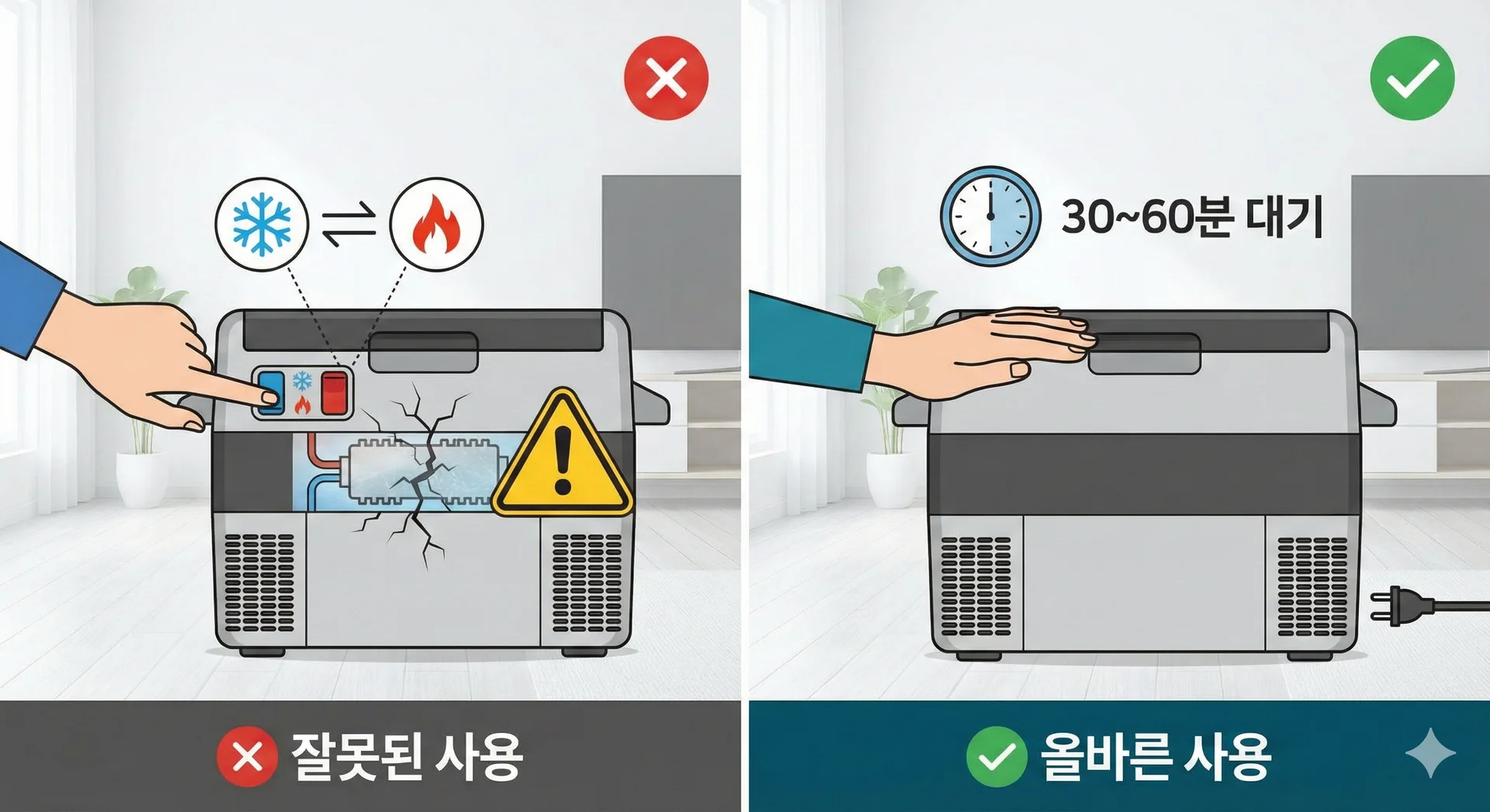 ๋ชจ๋๋ฅผ ๋ณ๊ฒฝํ ๋๋ ๋ฐ๋์ ์ ์์ ๋๊ณ ๋ด๋ถ ์จ๋๊ฐ ์์จ๊ณผ ๋น์ทํด์ง ๋๊น์ง ์ฝ 30๋ถ์์ 1์๊ฐ ์ ๋ ๊ธฐ๋ค๋ฆฐ ํ ์ ํํ๋ ๊ฒ์ด ์ข์ต๋๋ค.