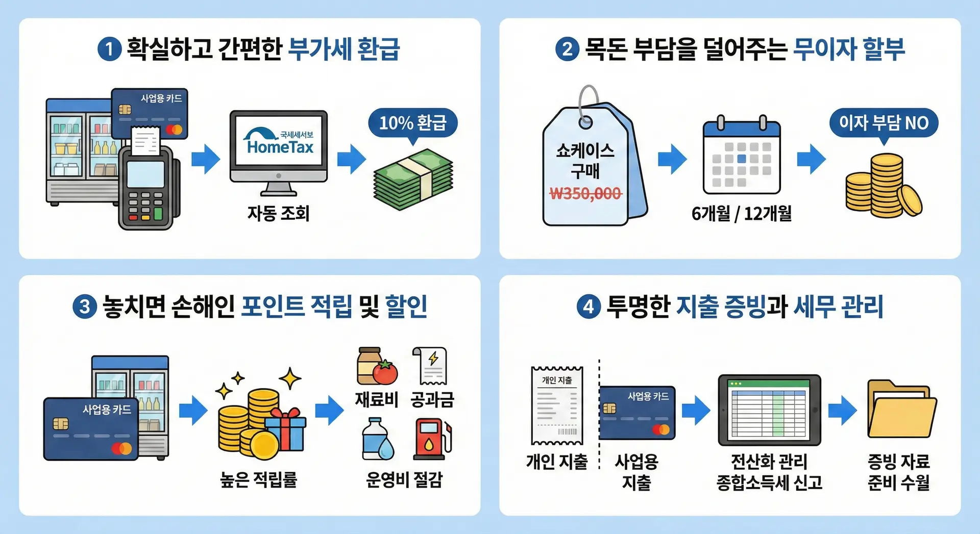 ๊ฐ์ธ ์นด๋๋ณด๋ค ์ฌ์ ์ ์ ์ฉ ์นด๋๊ฐ ์ฌ์ ๊ด๋ จ ์ง์ถ ์์ญ์์ ๋ ๋์ ํฌ์ธํธ ์ ๋ฆฝ๋ฅ ์ด๋ ํ ์ธ ํํ์ ์ ๊ณตํ๋ ๊ฒฝ์ฐ๊ฐ ๋ง์ต๋๋ค.