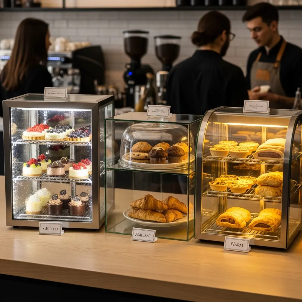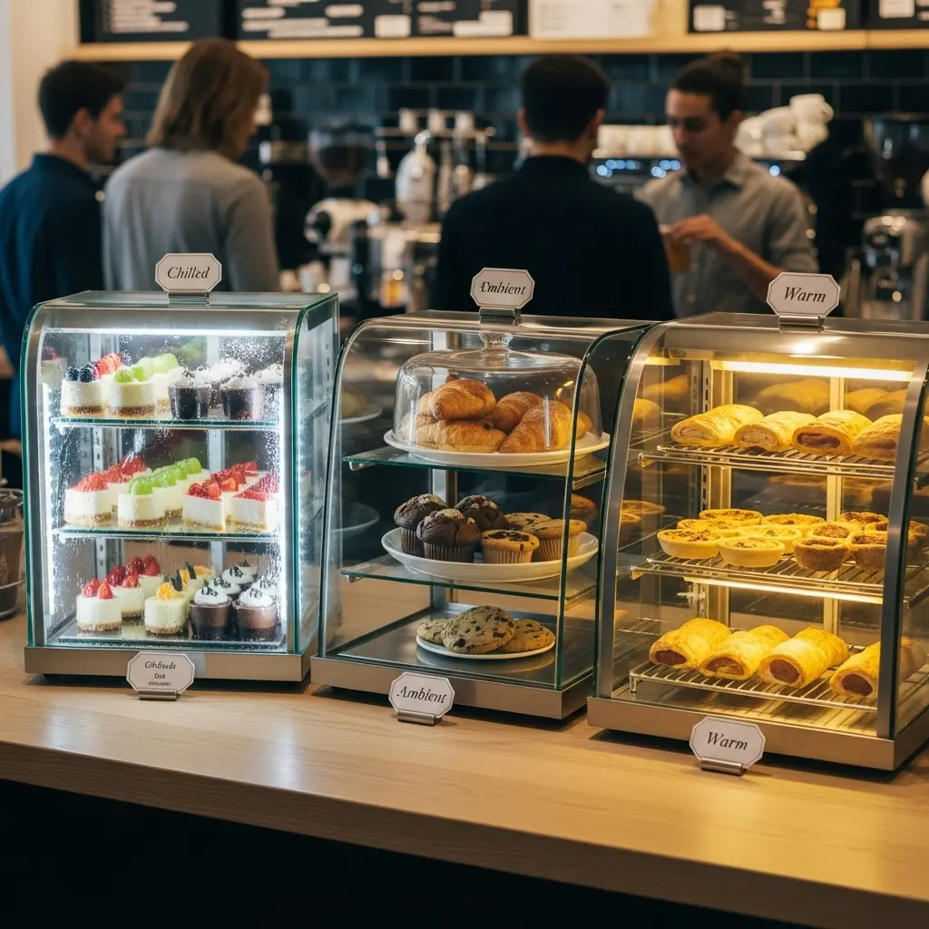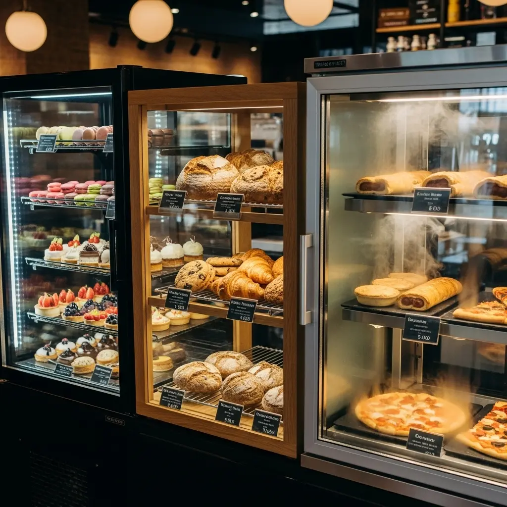 신선한 빵, 케이크, 마카롱 등 섬세한 디저트류를 위한 쇼케이스예요. 온도와 습도 조절 기능이 핵심이며, 주로 냉장 및 보온 기능이 함께 제공되기도 합니다.