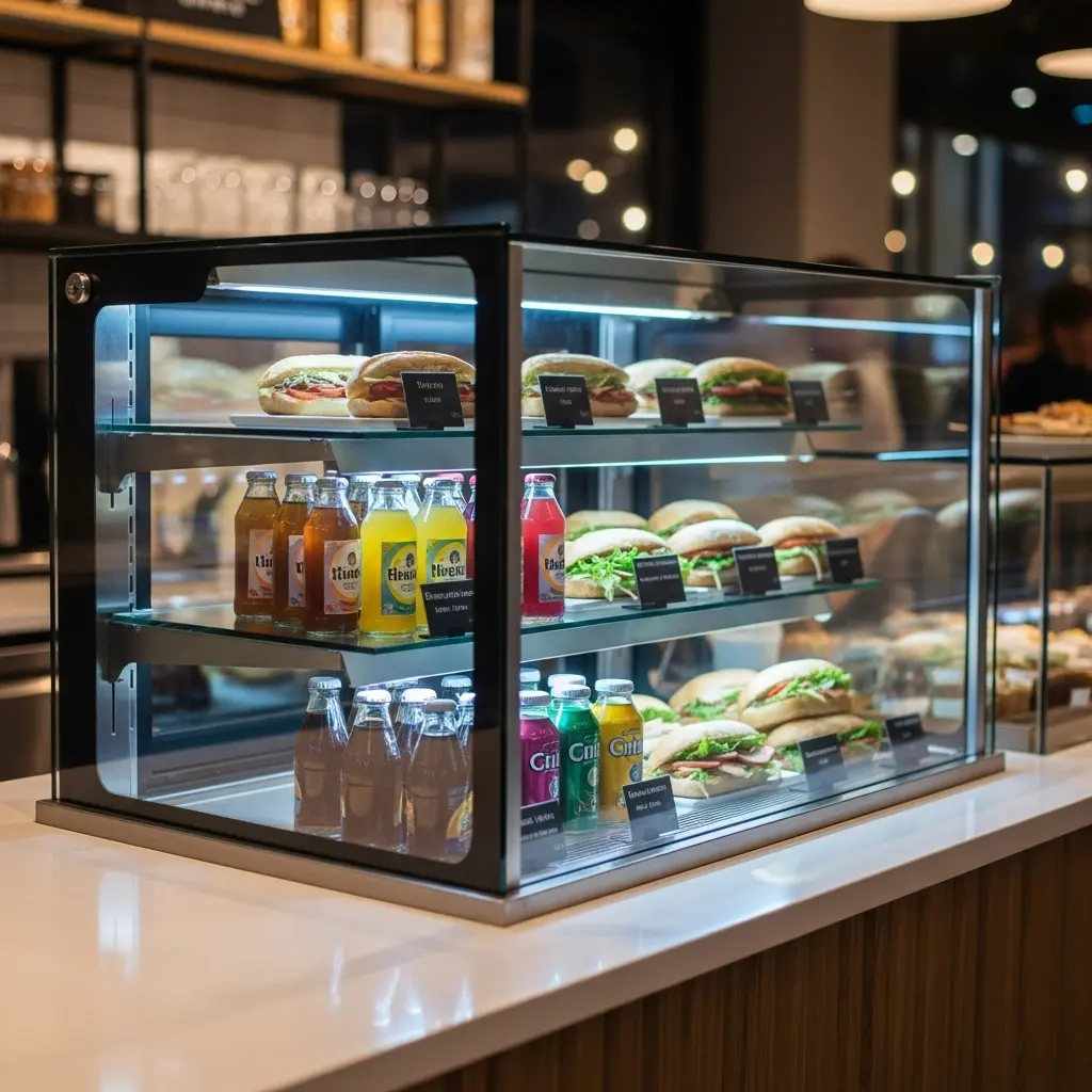 주로 카페나 편의점에서 볼 수 있는 쇼케이스로, 병 음료, 샌드위치, 샐러드 등 신선함을 유지해야 하는 제품들을 보관하고 진열하는 데 사용돼요.