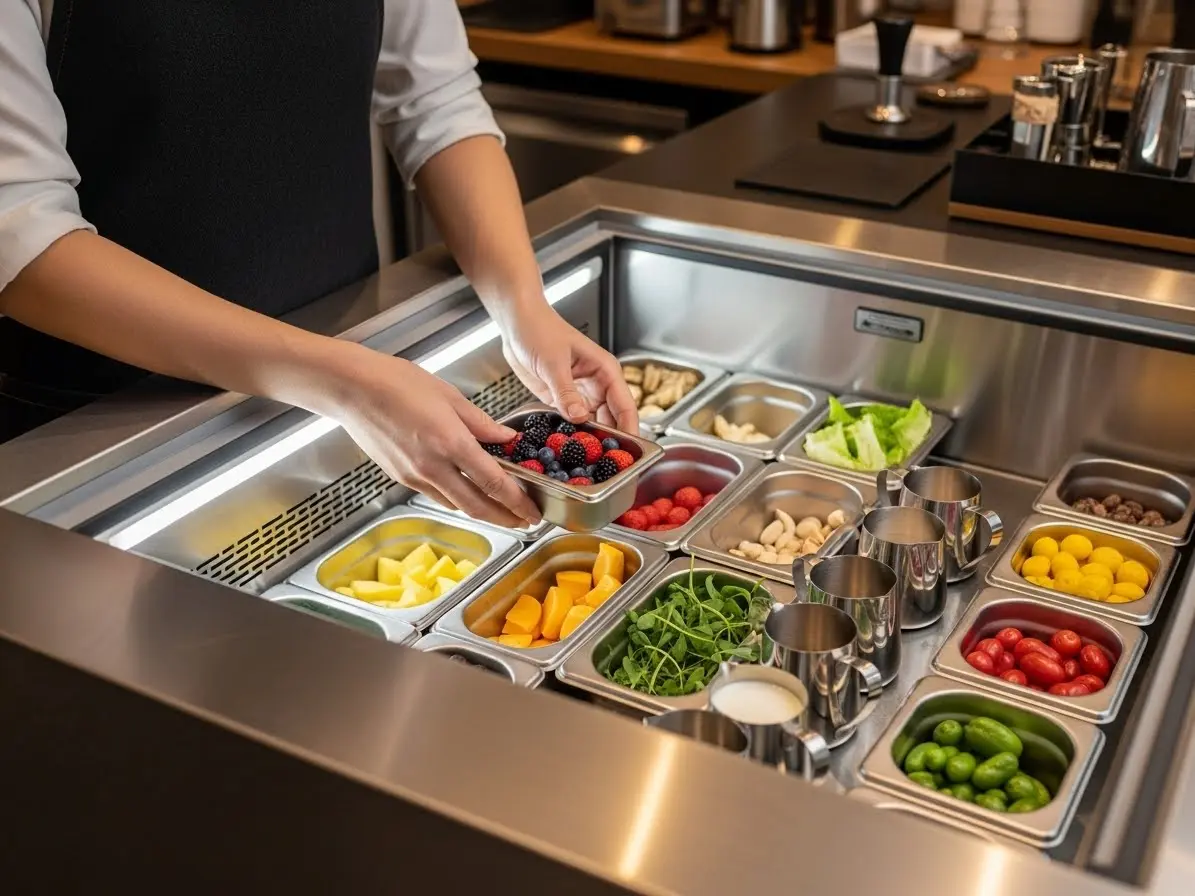 음료 제조 시 필요한 우유, 시럽, 과일 등 신선 재료를 바로 손이 닿는 곳에 보관할 수 있어 작업 동선을 최소화하고 시간을 절약할 수 있습니다.