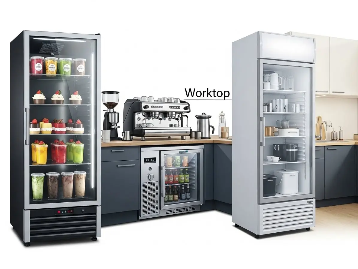 쇼케이스 냉장고: 음료, 케이크, 샌드위치 등 상품을 진열하여 고객에게 보여주는 용도. 미적인 요소가 중요합니다.