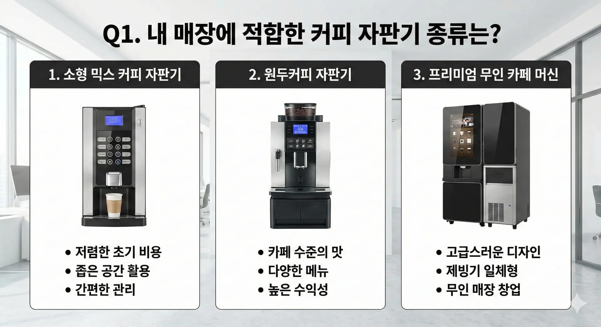 Q1. 커피 자판기 종류가 굉장히 다양한데, 내 매장이나 사업장에는 어떤 것이 적합할까요?