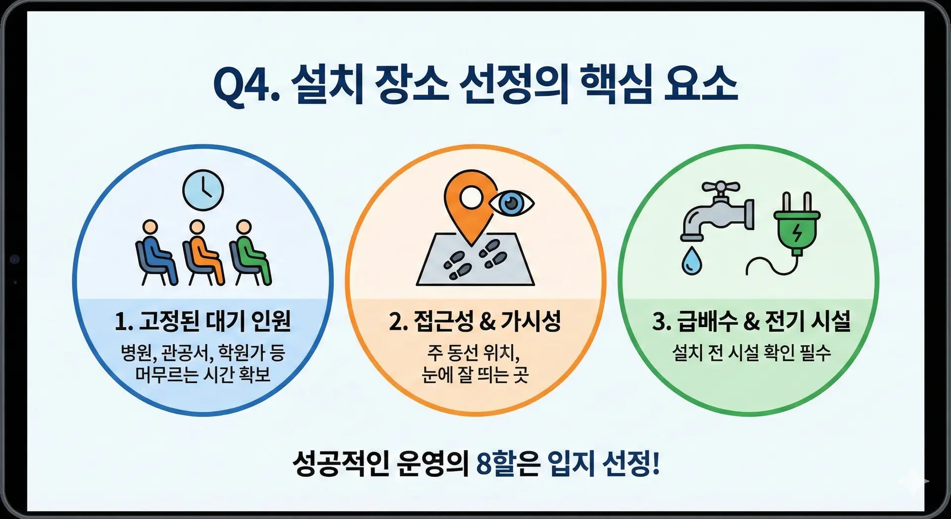 고정적인 대기 인원이 발생하는 곳, 가시성과 접근성이 좋은 주 동선에 위치해야 매출이 발생합니다.