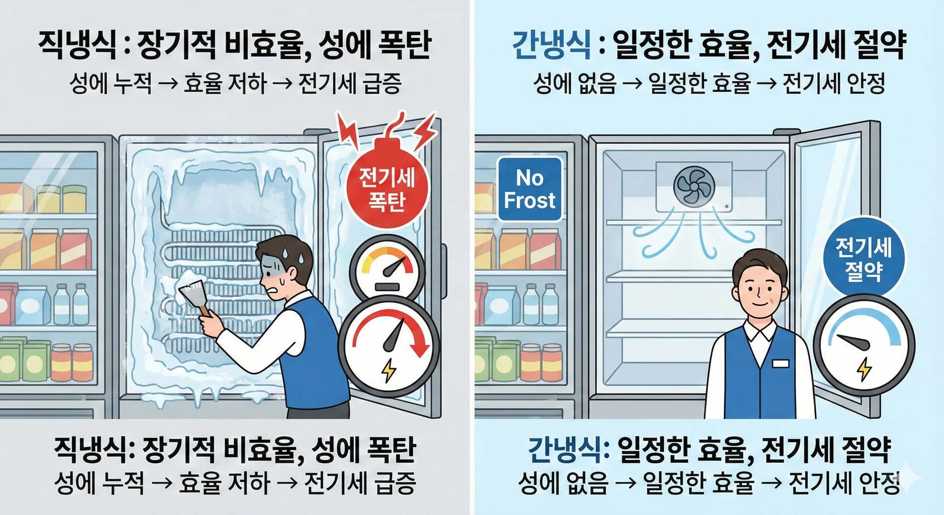 ์ฅ๊ธฐ์ ์ธ ๊ด๋ฆฌ ํธ์์ฑ๊ณผ ํจ์จ ์ ์ง๋ฅผ ์ํด '๊ฐ๋์(No Frost)' ๋ฐฉ์์ ๊ถ์ฅํฉ๋๋ค.