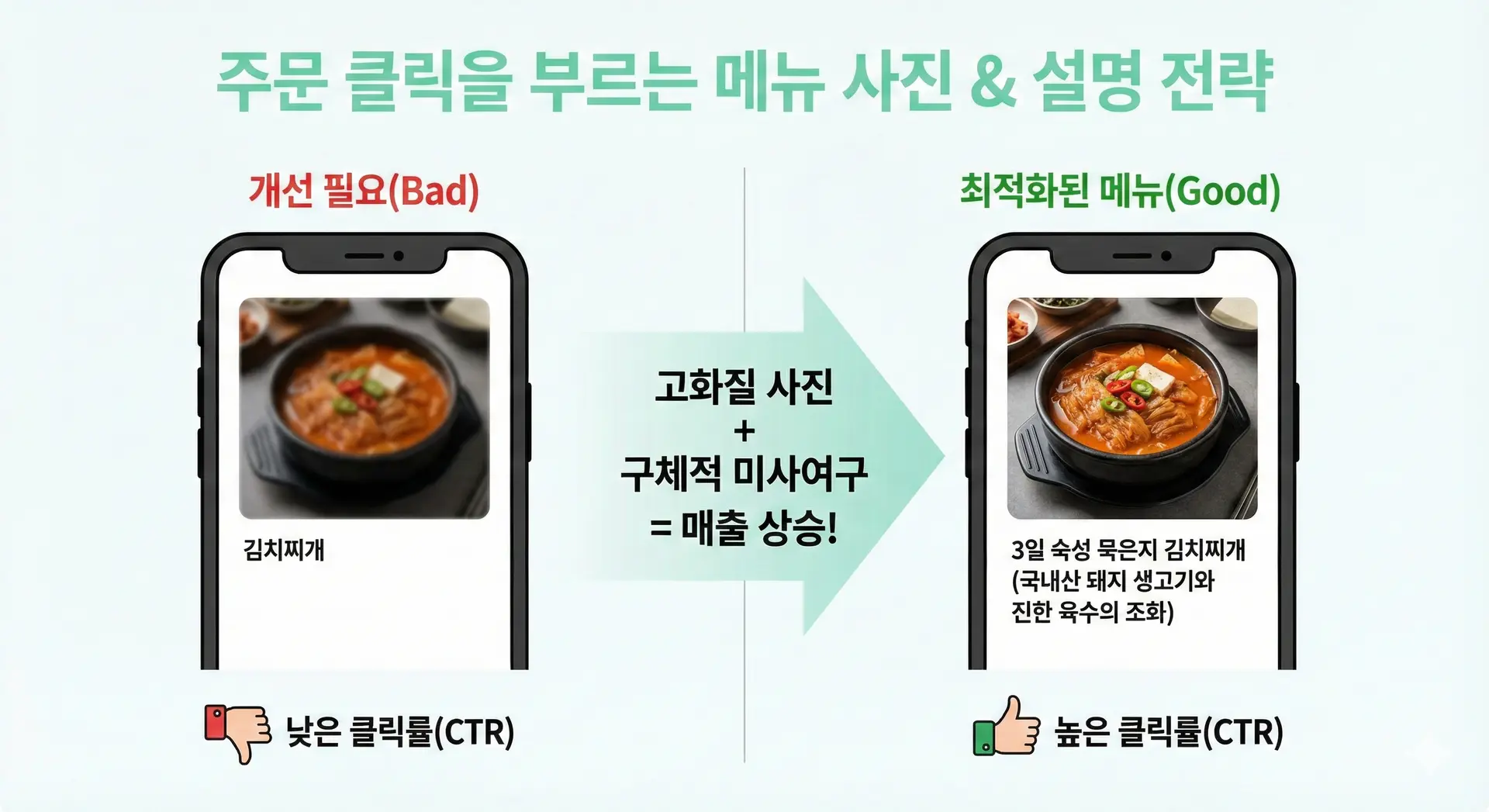 ๊ณ ํ์ง ์ด๋ฏธ์ง์ ๋งค๋ ฅ์ ์ธ ๋ฉ๋ด ์ค๋ช ์ ํตํด ํด๋ฆญ๋ฅ ๊ณผ ์ฃผ๋ฌธ ์ ํ์จ์ ๋์ฌ์ผ ํฉ๋๋ค.