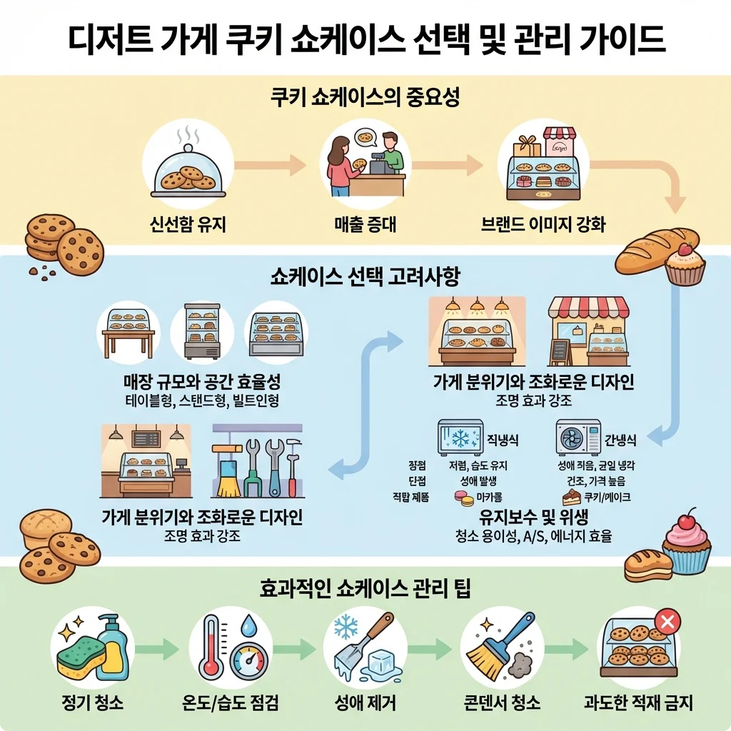 성공적인 쇼케이스 선택만큼 중요한 것이 바로 올바른 관리입니다. 정기적인 관리를 통해 쇼케이스의 성능을 최상으로 유지하고, 고객에게 항상 신선하고 맛있는 쿠키를 제공할 수 있습니다.