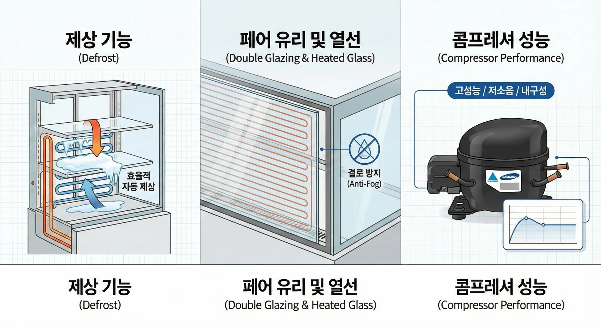 결로 방지를 위한 열선 처리 페어 유리, 안정적인 제상 기능, 신뢰할 수 있는 콤프레셔 탑재 여부를 반드시 체크하세요.