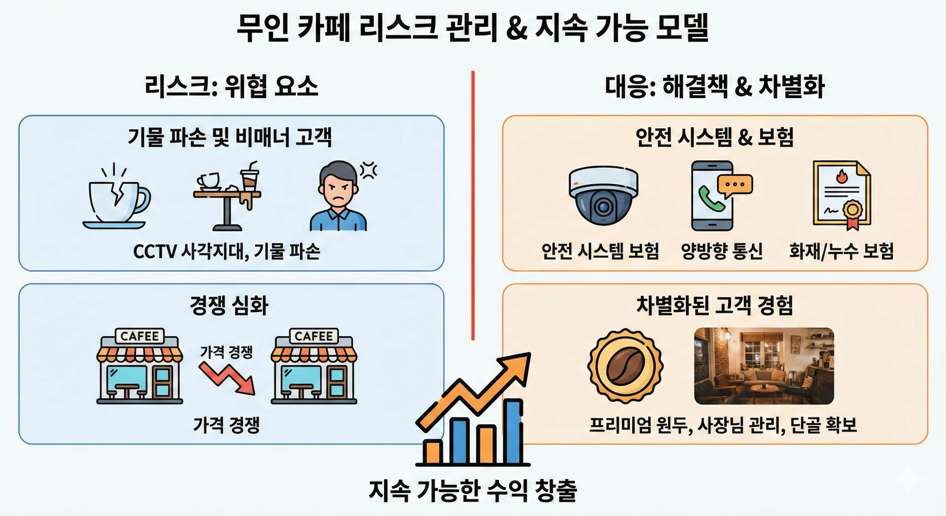 무인 카페 수익을 장기적으로 지키기 위해서는 잠재적인 위협 요소에 대비해야 합니다.